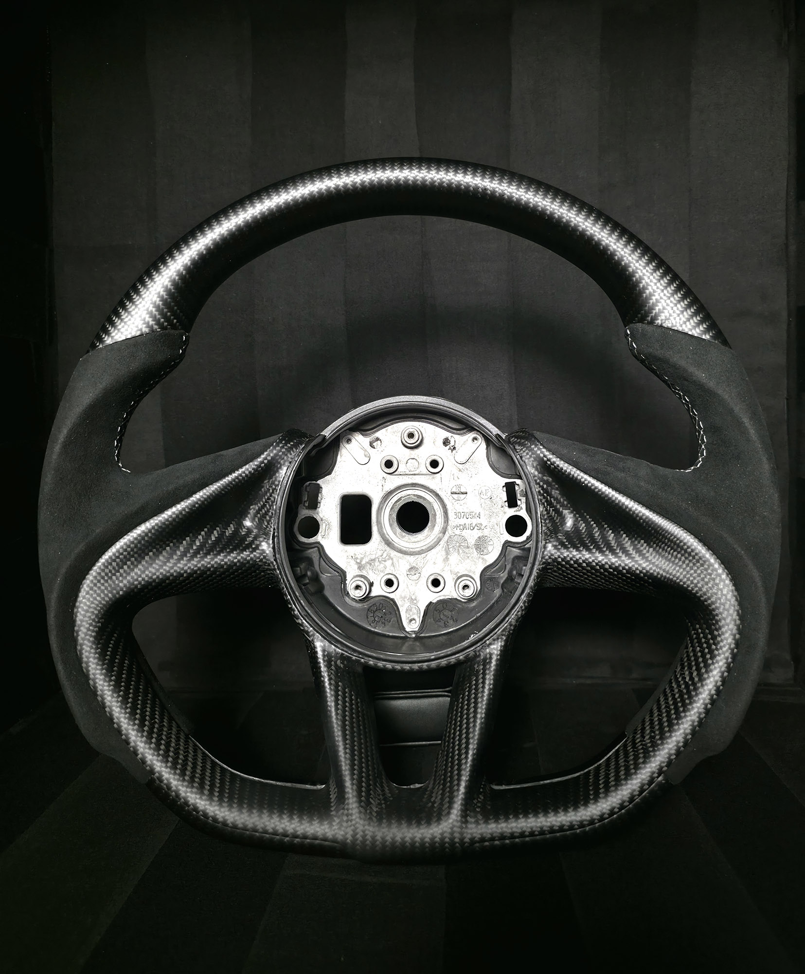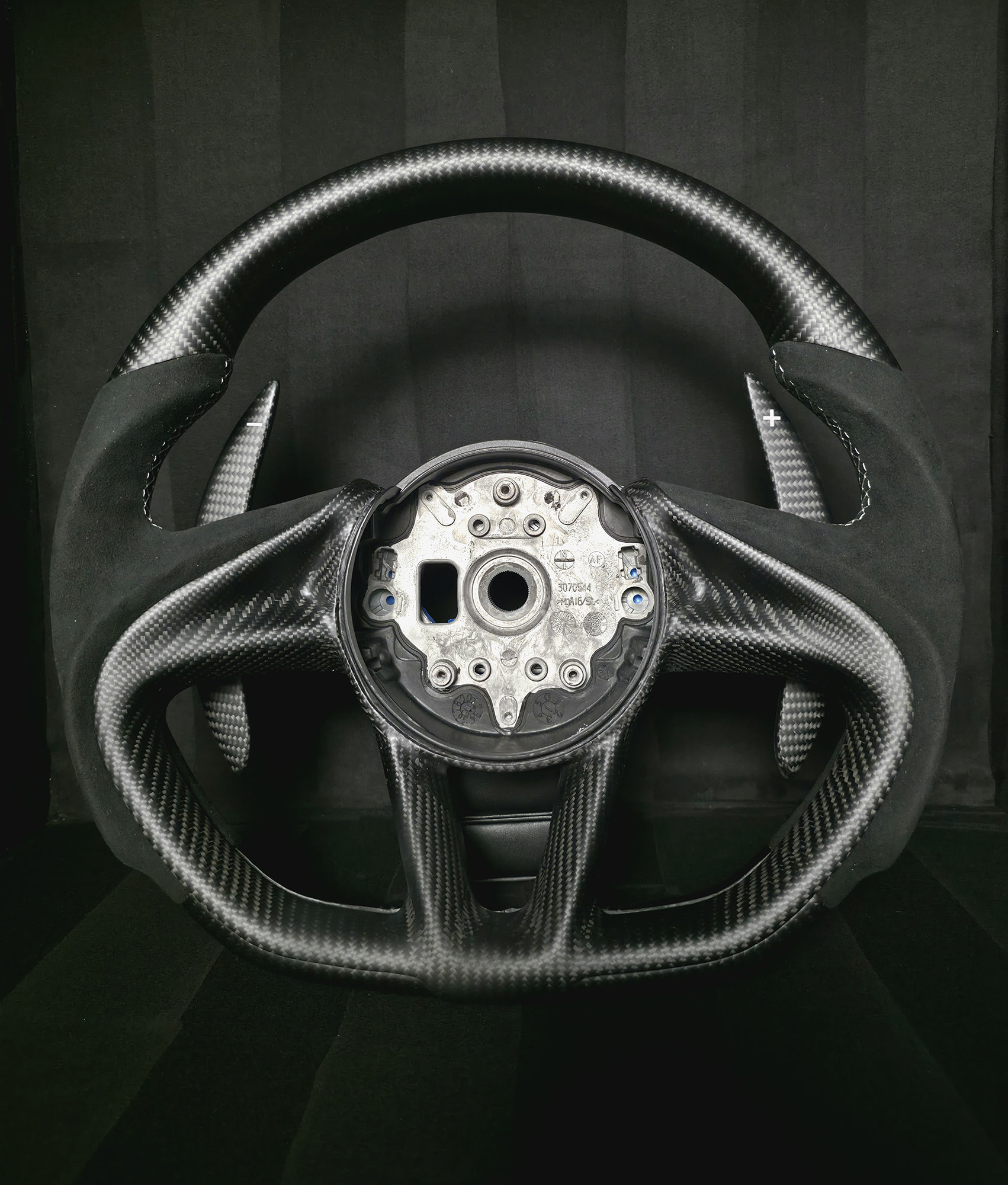 Crafted in matte carbon fiber with Alcantara side grips, this wheel delivers a motorsport-inspired tactile feel while maintaining the refined aesthetic McLaren owners expect. This product is paired with our matte carbon fiber paddle shifters, completing a perfectly balanced interior upgrade that complements the car’s aggressive yet minimalist cabin.
