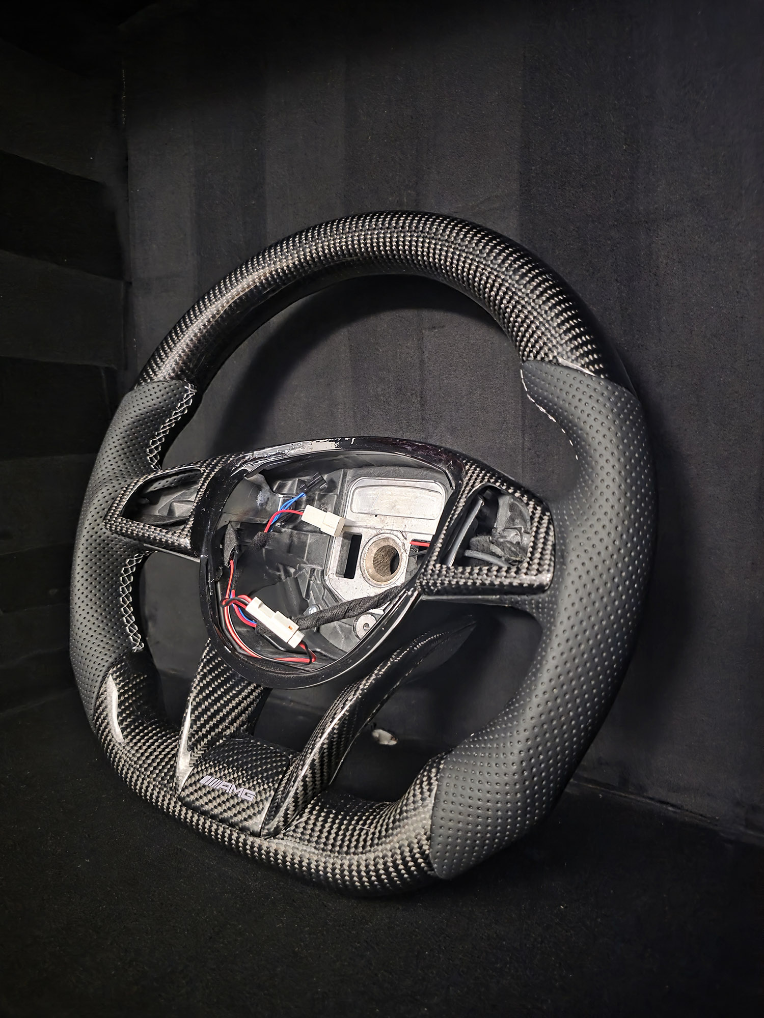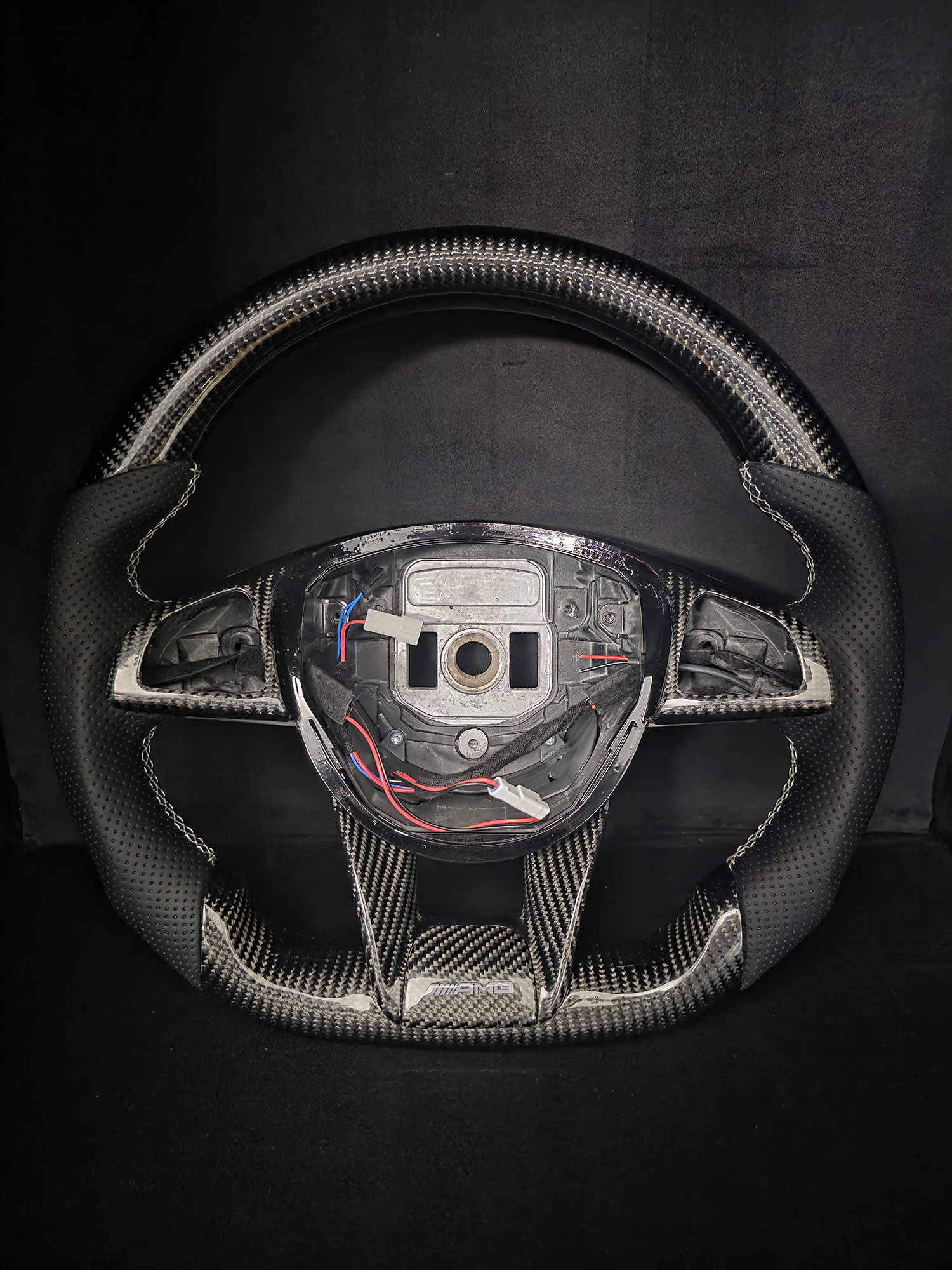 Handcrafted gloss carbon fiber steering wheel designed for Mercedes-AMG performance vehicles (2016–2019). Featuring black perforated leather grips and integrated heating, it combines everyday comfort with a motorsport-inspired aesthetic. The gloss carbon finish delivers a refined, high-performance appearance that elevates the cabin experience.